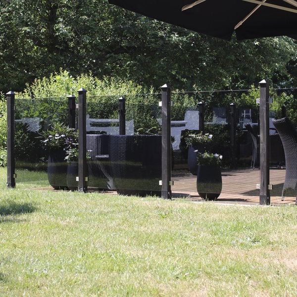 HORTUS -lasiaitasetti, 3 kpl paneeleita (kevyesti savun värinen), 4 kpl tolppia ja 4 kpl tolpanhattuja.