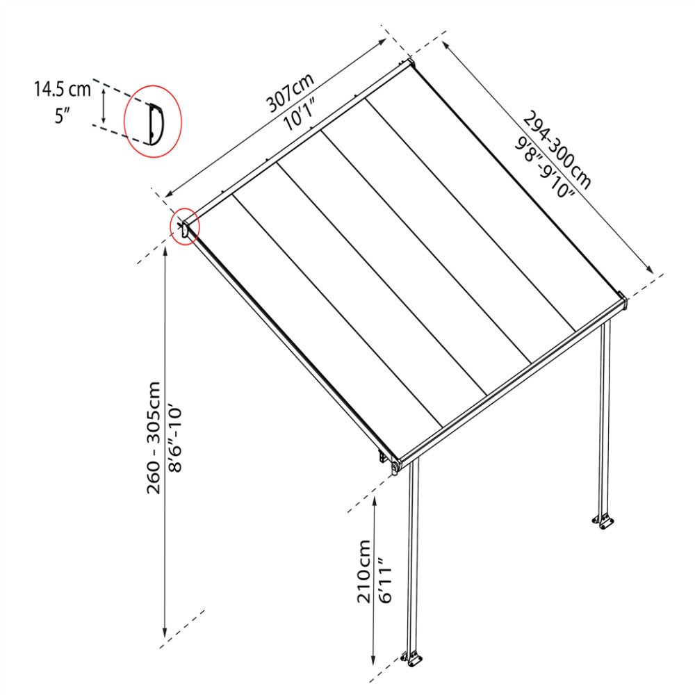 • Terassikatoksen mitat: leveys: 305 x syvyys: 295 x korkeus: 260-305 cm