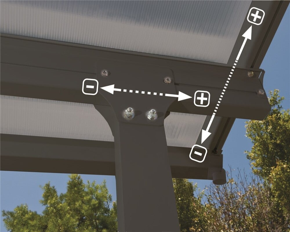 Tämän vankkarakenteisen terassikatoksen tukipylväät ovat sijoittelunsa suhteen säädettävät, joten sovittaminen ja asentaminen omaan käyttökohteeseen käy helposti.