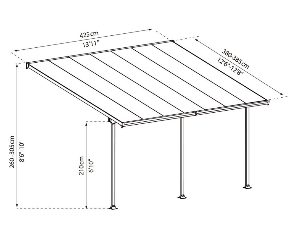 • Terassikatoksen mitat: leveys: 425 x syvyys: 380-385 x korkeus: 260-305 cm