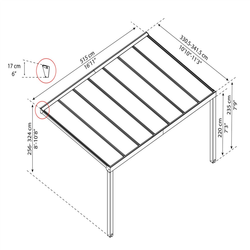 Terassikatokset mitat: leveys 515 x syvyys 330,5-341 x korkeus 256,5-324 cm