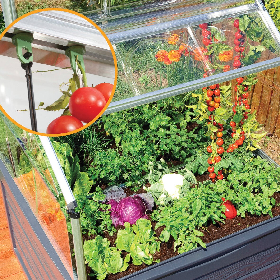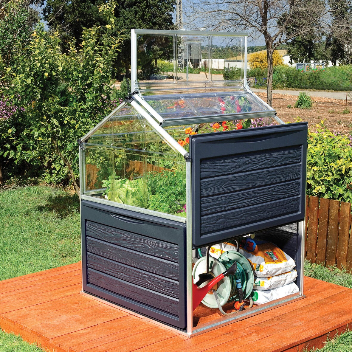 Tämä kohotettu pienoiskasvihuoneen ja kasvilavan yhdistelmä on täydellinen hyötykasvien kasvattamiseen! Reilusti maasta kohotettu kasvilava suojaa kasveja etanoilta ja muilta tuholaisilta sekä auttaa pitämään kasvualustan vapaana rikkaruohoista. Lisäksi valaistusolosuhteet paranevat tällä tavalla. Lähes rikkoontumattomat ja UV -suojatut polykarbonaattipaneelit pitävät liiallisen UV -säteilyn sekä kylmän ja viiman loitolla herkistä kasveista. Maasta reilusti kohotettu kasvupenkki tekee kasvien huoltamisesta huomattavan ergonomista. Kasvilavan alaosa on samalla kätevä säilytystila erilaisille puutarhavälineille ja tarvikkeille.