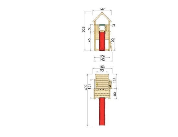Tähän leikkitorniin kiivetään kiipeilyseinän kautta. Puinen harjakatto tarjoaa suojaa ja 160cm seisomakorkeuden. Leikkitilaa on tornissa innovatiivisesti kahdella tasolla ja parvekkeilta näkee maailman kokonaan uudella tavalla. Tilanteiden haltuun ottamista auttaa torniin kuuluva ohjauspyörä.