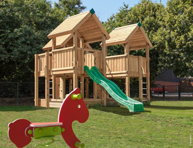 - Kolme leikkitornia yhdistettynä laajalla avoimella oleskelutasolla, harjakatot (puuta)