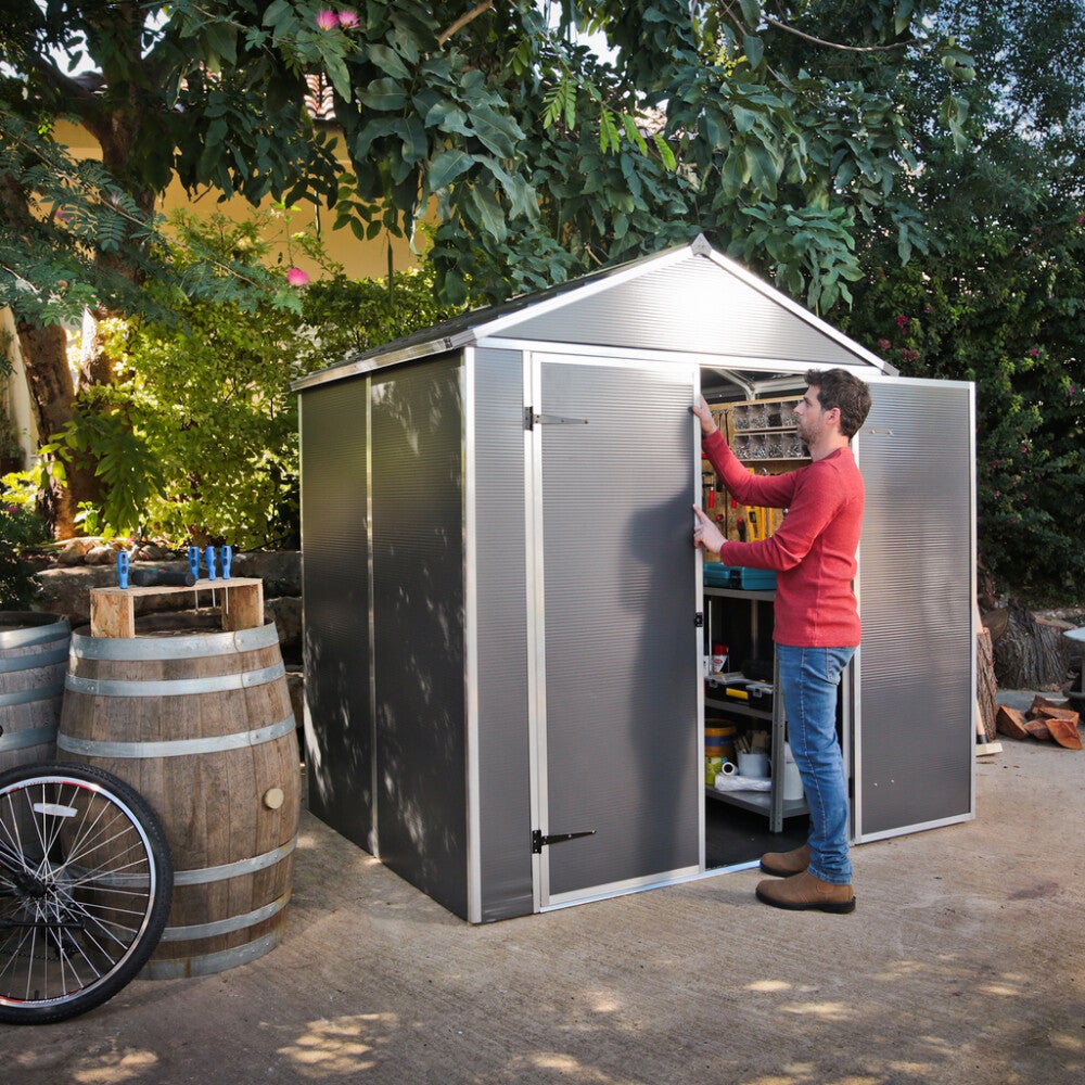 Palram - Canopian puutarhavaja Rubicon on oikea valinta puutarhasi erilaisiin varastointi- ja säilytystarpeisiin. Käytännössä rikkoutumattomat polykarbonaattipaneelit ja vahvistettu alumiinirunko tekevät Rubicon -puutarhavajasta ainutlaatuisen vankan ja kestävän. Tämä puutarhavarasto on varustettu läpinäkyvillä kattopaneeleilla, jota tuovat varastoon valoa, mutta suodattavat haitalliselta UV -säteilyltä, joka voisi haalistuttaa ja vaurioittaa varastossa säilytettäviä tavaroita. Alumiiniprofiileista koostuva runko takaa erittäin vakaan rakenteen Erittäin kestävä polykarbonaattilevyistä koostuva katto tuo varastoon luonnollista valoa Easy-Slide" -järjestelmä tarkoittaa seinä- ja kattopaneeleiden helppoa liu'uttamista paikoilleen (varmista, että ympärillä on riittävästi tilaa kattopaneeleiden asennusvaiheessa) 100% UV -suojatut 10 mm monikerroksiset, vahvistetut polykarbonaattipaneelit Lukkokiinnikkeet ovessa mahdollistavat turvallisuutta lisäävän lukituksen (lukko hankittava erikseen) Tuuletusventtiili vajan edessä ja takana Sokkeli sinkittyä terästä vakauden maksimoimiseksi Leveät kaksoisovet ja matala kynnys helpottavat kulkua vajaan Huoltovapaa, pestävissä, ei ruostu, ei lahoa, ei kuoriutuvaa maalia Liukumaton lattia Voidaan ankkuroida kiinteään alustaan (metalli, puu, betoni) Kaikki komponentit ovat kierrätettäviä.