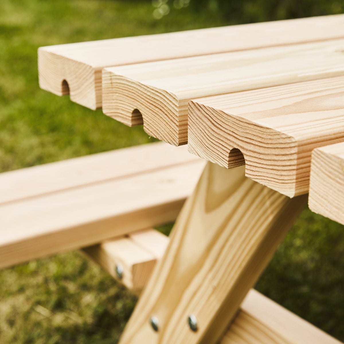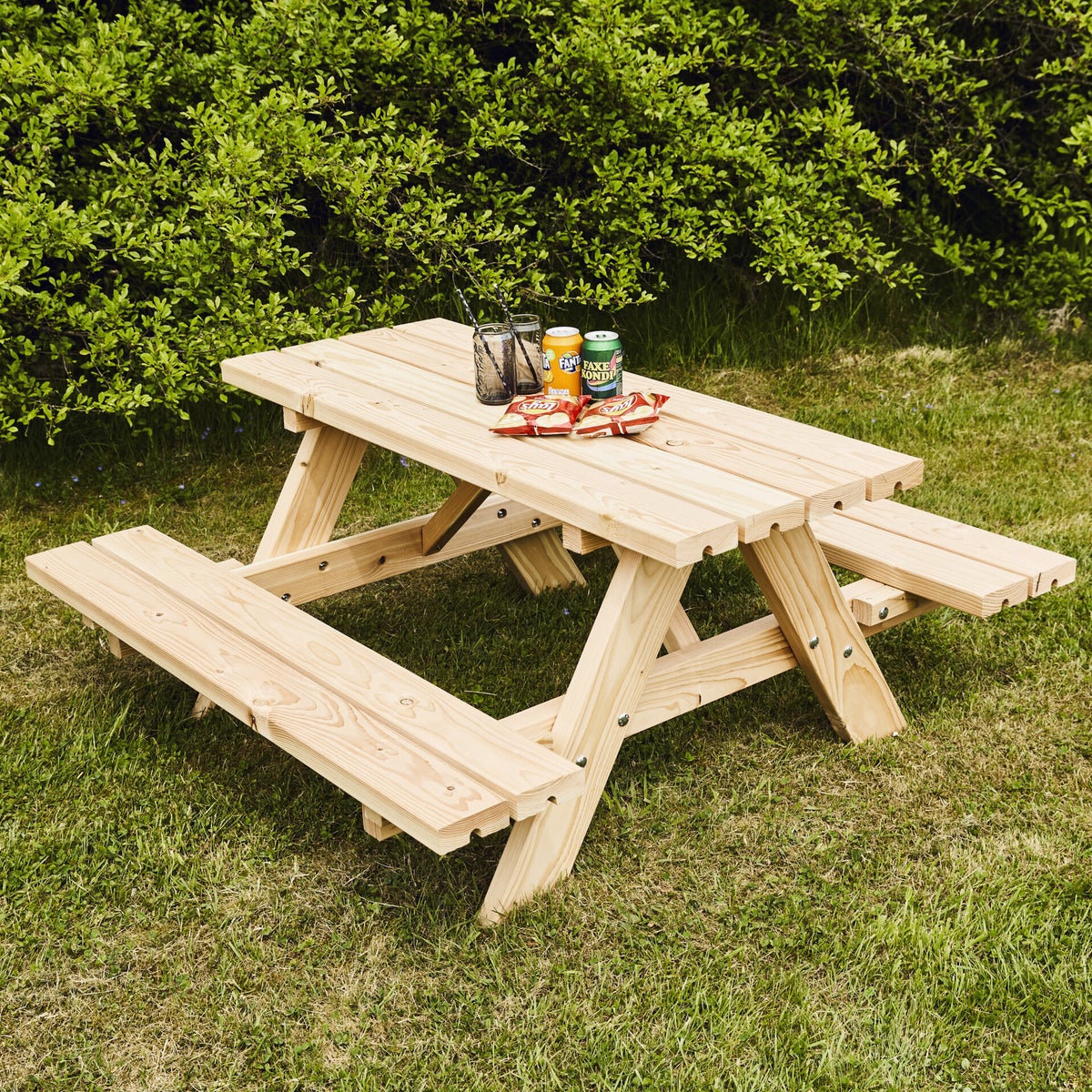 Lasten picnic -pöytäsetti, jonka materiaalina on douglaskuusi, joka on luonnostaan lahonkestävää. Istuimet ja pöytä 42 mm paksuiset.
