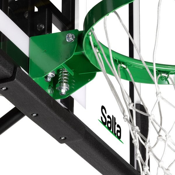 Salta Guard -koripallotelineen taustalevy on erittäin vahvaa, iskunkestävää ja läpinäkyvää polykarbonaattia ja sen reunus on tukevaa terästä. Teräksinen korirengas on varustettu kahdella vahvalla jousella, joten tämä teline mahdollistaa kaikkein näyttävimmätkin donkkaukset! Korirengas erittäin helposti ja kätevästi yhden käden otteella säädettävissä kuuteen eri korkeuteen välillä 230-305 cm. Salta Guard sopikin muunneltavuutensa ansiosta hienosti kaikenikäisille ja -mittaisille pelaajille.