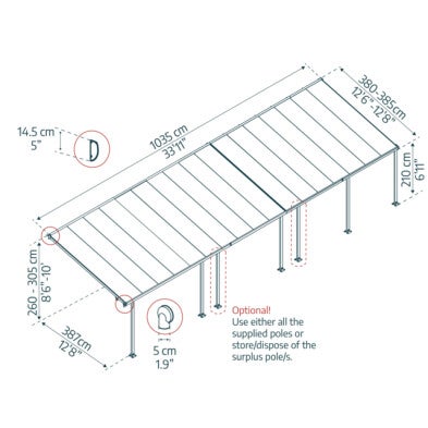 Ota kaikki hyöty irti terassistasi tällä Palram Feria -terassikatoksella. Terassikatos tuo huomattavaa lisäarvoa terassin käyttöön. Feria -terassikatos on kaunis ja huoltovapaa ratkaisu terassin kattamiseen. Sitä voi käyttää tilanteen mukaan myös ajoneuvokatoksena, sisäänkäynnin katoksena tai aurinkosuojana. Feria -katos suojaa ihmiset ja materiaalit auringon haitallisilta UV -säteiltä.