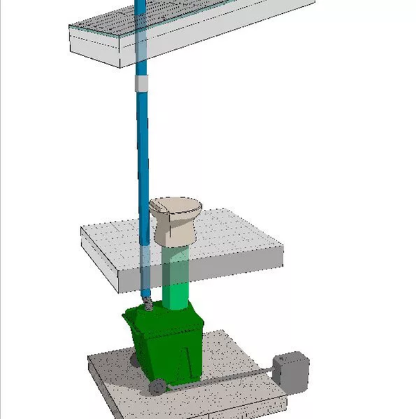 Koko kompostisäiliö ja jätekuilu asettuu istuinpulpetin alle. Green Toiletin jätekuilu on säätyvä: se voidaan asettaa 1-30 cm säiliön yläpuolelle. Istuinpulpetin alapuolella tulisi olla vähintään noin 72 cm tilaa säiliölle ja minimissään 60 cm leveä aukko huussin takana. Tarvittaessa voi usein lisätilaa saada kaivamalla maata pois istuinpulpetin alta tai korottamalla huussia tai istuinpulpettia. Jos jätekuilu jää alatasoon, voi siitä sahata ylimääräisen osan pois.